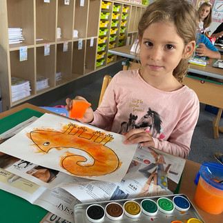 Im Kunst und Gestalten Unterricht fertigten wir unser erstes Kunstwerk an. Passend zu unserem Klassenmaskottchen malten und tupften wir mit Wasserfarben ein wunderschönes Chamäleon!